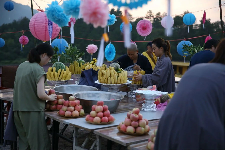晚课、烧烟供、放蒙山后,山丘上,茶、食、灯、香已经具备,月轮初上,众人先是合唱了《没有共产党就没有新中国》,表达对祖国的热爱和感恩。唱毕,月光清凉,淡茶微香,《月光菩萨茶供》开始了,智渡法师带领大众诵持仪轨,恭敬供养佛菩萨。